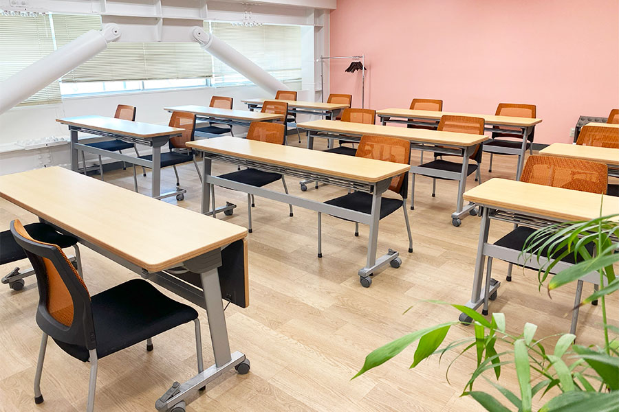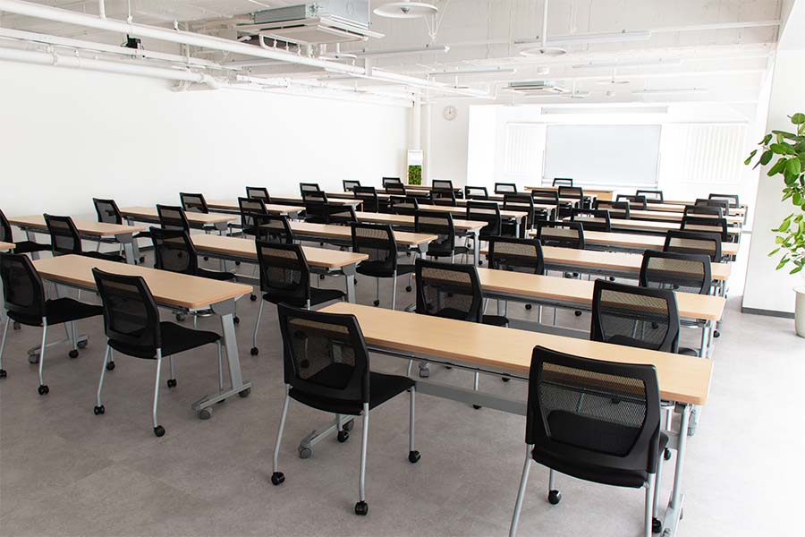 常設備品: (無料)机25台/椅子50脚/ホワイトボード(W:2400 可動式)/スクリーン(正面天吊120インチ)/演台/丸机2卓+イス8脚/傘立て/ハンガーラック(ハンガー付き20本)/●延長コード常備2本【追加が必要な場合は、必ず備考欄にご記入ください。当日追加は有料となります】● |