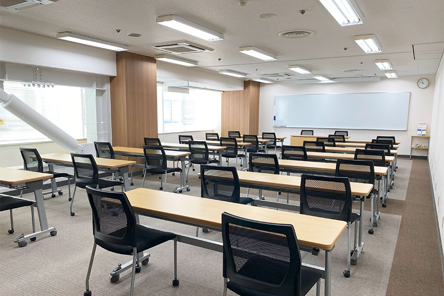 常設備品: (無料)机25台/椅子50脚/ホワイトボード(正面固定)/スクリーン(正面天吊120インチ)/演台/傘立て/ハンガーラック(ハンガー付き 20本)/空気清浄機/サーキュレーター ※天吊りスクリーンを固定ホワイトボードの前に下ろすタイプのため同時使用はできません ●延長コード常備2本【追加が必要な場合は、必ず備考欄にご記入ください。当日追加は有料となります】● |