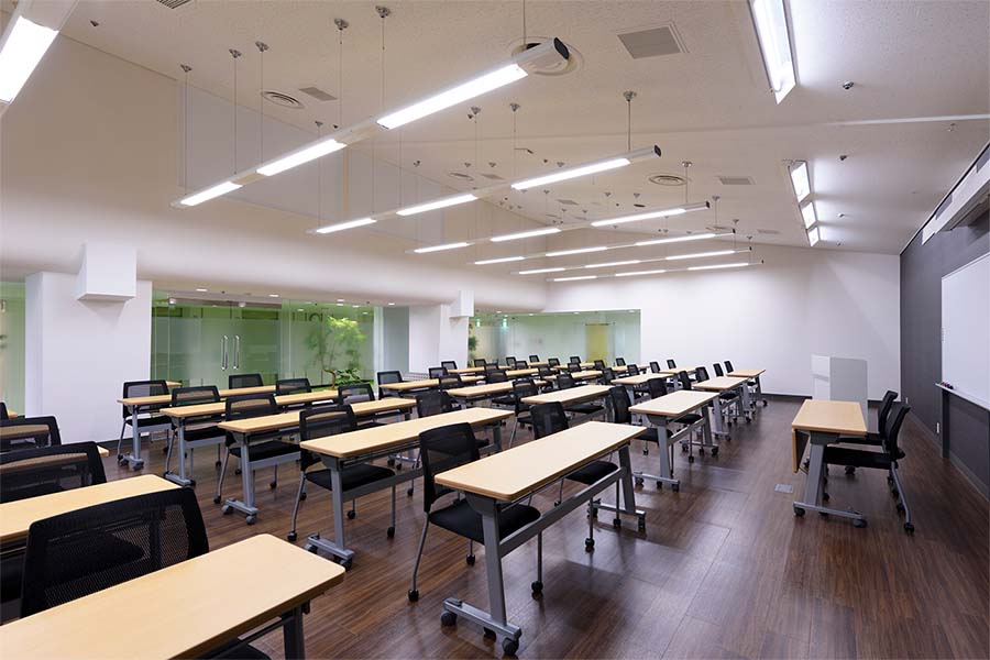 常設備品: (無料)机25台/椅子50脚/ホワイトボード(正面固定)/スクリーン(正面天吊120インチ)/演台/傘立て/ハンガーラック(ハンガー付き 20本)/空気清浄機/サーキュレーター ※天吊りスクリーンを固定ホワイトボードの前に下ろすタイプのため同時使用はできません ●延長コード常備2本【追加が必要な場合は、必ず備考欄にご記入ください。当日追加は有料となります】● |