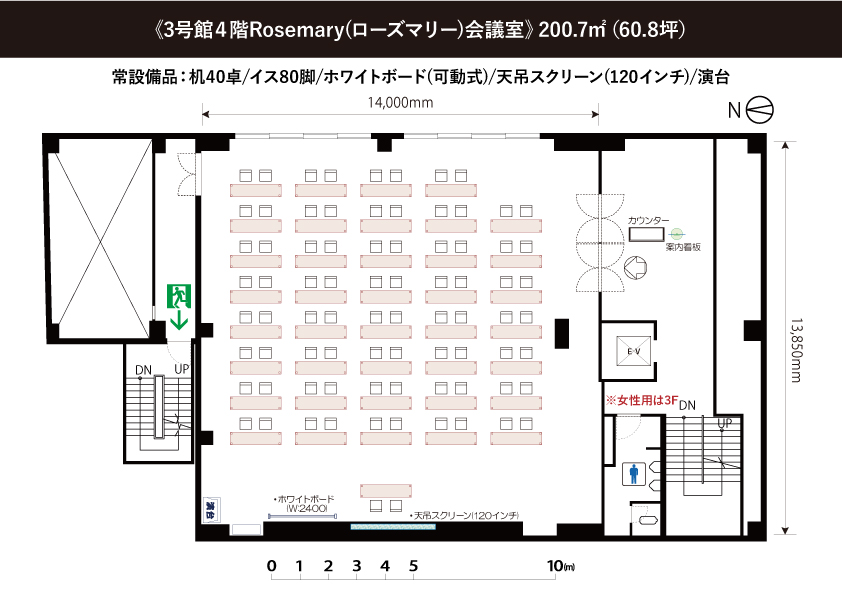 常設備品: (無料)机40台/椅子80脚/ホワイトボード(W:2400 可動式)/スクリーン(正面天吊120インチ)/演台/傘立て/ハンガーラック(ハンガー付き)●延長コード常備2本【追加が必要な場合は、必ず備考欄にご記入ください。当日追加は有料となります】●