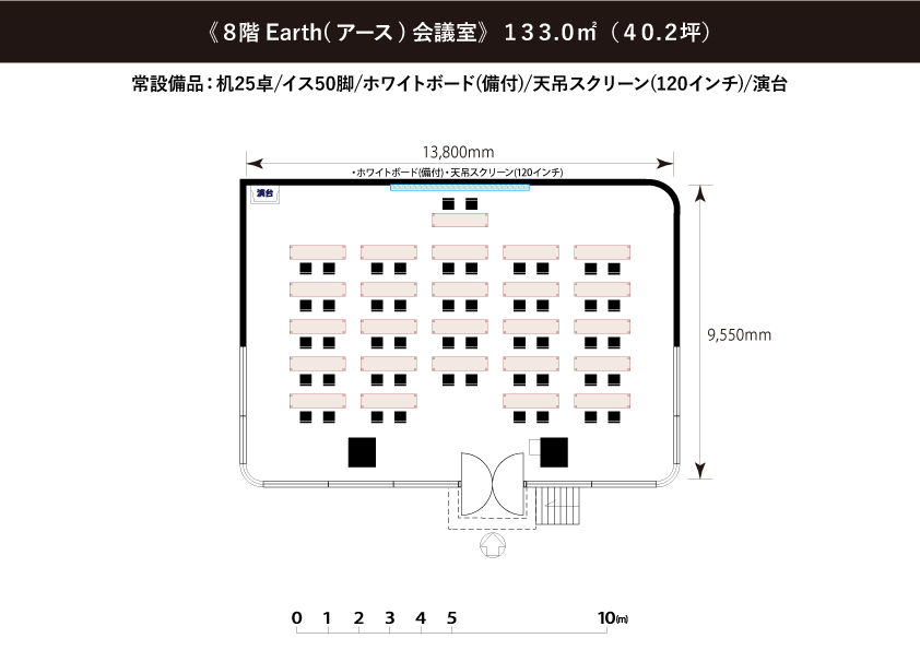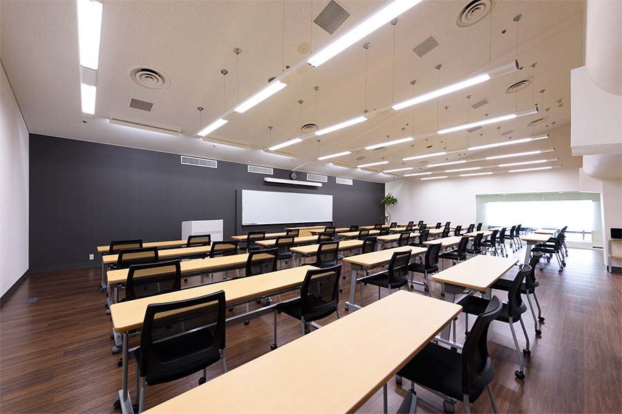 常設備品: (無料)机25台/椅子50脚/ホワイトボード(正面固定)/スクリーン(正面天吊120インチ)/演台/傘立て/ハンガーラック(ハンガー付き 20本)/空気清浄機/サーキュレーター ※天吊りスクリーンを固定ホワイトボードの前に下ろすタイプのため同時使用はできません ●延長コード常備2本【追加が必要な場合は、必ず備考欄にご記入ください。当日追加は有料となります】● |