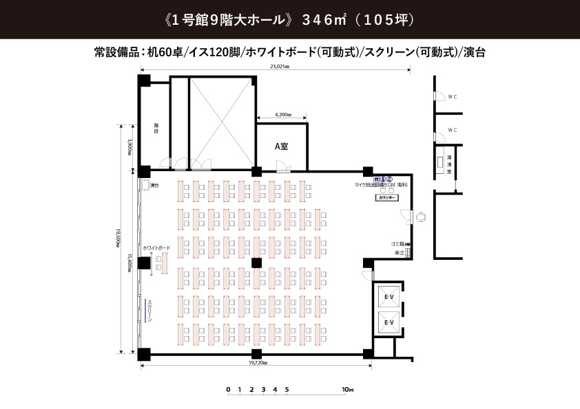 常設備品: (無料)机60台/椅子120脚/ホワイトボード(可動式)/スクリーン(可動式100インチ)/演台/花台/傘立て2台/ハンガーラック3台(ハンガー付き75本)●延長コード常備4本【追加が必要な場合は、必ず備考欄にご記入ください。当日追加は有料となります】● |