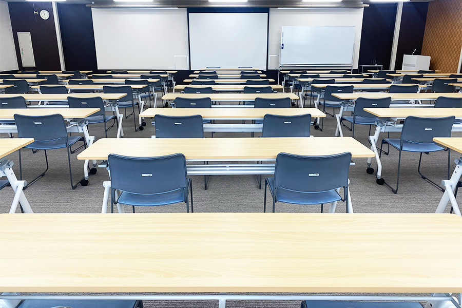 常設備品: (無料)机40台/椅子80脚/ホワイトボード(W:2400 可動式)/スクリーン(正面天吊120インチ)/演台/傘立て/ハンガーラック(ハンガー付き)●延長コード常備2本【追加が必要な場合は、必ず備考欄にご記入ください。当日追加は有料となります】●