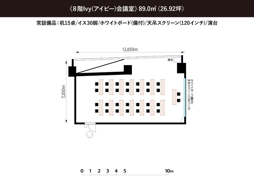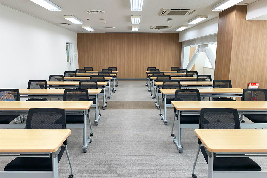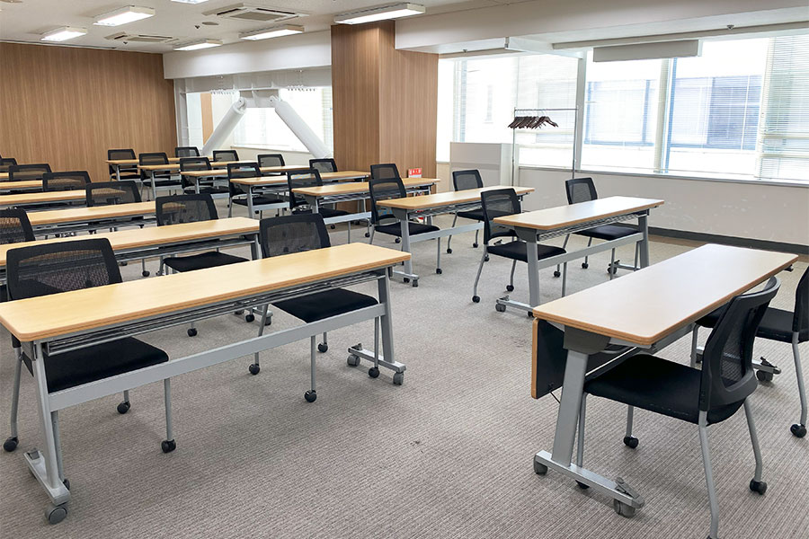 常設備品: (無料)机15台/椅子30脚/ホワイトボード(正面固定)/スクリーン(正面天吊120インチ)/演台/傘立て/ハンガーラック(ハンガー付き 20本) ※天吊りスクリーンを固定ホワイトボードの前に下ろすタイプのため同時使用はできません ●延長コード常備2本(追加が必要な場合は、必ず備考欄にご記入ください。当日追加は有料となります)● |